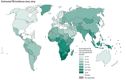 Figuur 3. Voorkomen van tuberculose wereldwijd (Bron: WHO (15)