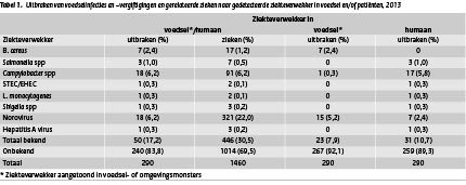 Dit artikel geeft een overzicht van het aantal door de NVWA en GGD’en geregistreerde aan voedsel gerelateerde uitbraken bij het CIb, en meldingen van specifieke meldingsplichtige micro-organismen die deels aan voedsel gerelateerd zijn. In totaal werden er 290 aan voedsel gerelateerde uitbraken in 2013 geregistreerd; 14 meer dan in het jaar ervoor. De uitbraken veroorzaakten minstens 1460 zieken, een aanzienlijk lager aantal dan in 2012 (2607 mensen). Dit komt doordat de uitbraken in 2013 minder omvangrijk waren dan in 2012. De belangrijkste humane verwekkers van uitbraken van voedselinfecties waren in 2013 Campylobacter en norovirus. Van de specifieke meldingsplichtige micro-organismen die deels aan voedsel gerelateerd zijn, leidden Shigella en het hepatitis A-virus tot het grootste aantal zieken.