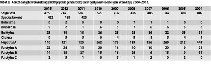 Tabel 2: Aantal aangiftes van meldingsplichtige pathogenen (GGD) die mogelijk aan voedsel gerelateerd zijn, 2004-2013 (klik op de tabel voor een grote weergave)