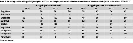 Tabel 3. Percentage van de meldingsplichtige aangiftes (GGD) dat werd opgelopen in het buitenland en dat werd veroorzaakt door voedsel of water, indien bekend, 2010-2013 (klik op de tabel voor een grote weergave).