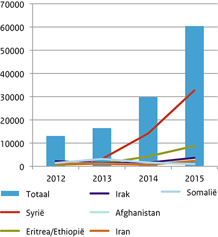 In 2015 arriveerden circa een miljoen asielzoekers in Europa. Ongeveer 80% van de asielzoekers kwam uit Syrië, Irak en Afghanistan en vluchtte vanwege voortdurende conflicten. Armoede, mensenrechtenschending en verslechterende veiligheidsomstandigheden droegen daarnaast bij aan een toename van asielzoekers uit Eritrea, Somalië, Marokko, Iran en Pakistan naar Europa. Ook Nederland kreeg te maken met de toenemende asielzoekersstroom. In 2015 was het aantal asielaanvragen in Nederland tweemaal zo hoog vergeleken met 2014 (Figuur 1). De toename in Nederland was vooral toe te schrijven aan de instroom van Syrische asielzoekers.