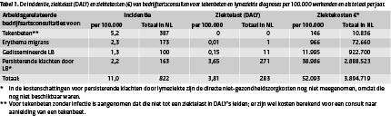 Inzicht in het vóórkomen van lymeziekte is vereist voor gericht en preventief beleid. In de algemene bevolking is de incidentie van tekenbeten en erythema migrans (EM) tussen 1994 en 2009 verdrievoudigd. (2) Recent heeft het RIVM voor het eerst ook het voorkomen van arbeidsgerelateerde tekenbeten en lymeziekte onderzocht.(1) Landelijke aantallen consultaties bij de bedrijfsarts voor arbeidsgerelateerde tekenbeten werden geschat op 387 in 2010 (Tabel 1). Alle bedrijfsartsen in Nederland rapporteerden samen 173 diagnoses van arbeidsgerelateerde EM, 100 diagnoses van gedissemineerde lymeziekte en 163 diagnoses van persisterende klachten door arbeidsgerelateerde lymeziekte. De bijbehorende schattingen voor de ziektelast (DALY) en kosten door arbeidsgerelateerde gevallen waren respectievelijk 283 DALY (Disability Adjusted Life Year)’s en