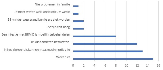 - Dertien dragers (45%) waren goed in staat om uit te leggen wat resistentie betekent, hoe de besmettelijkheid is en wat de ernst is. Dertien konden dat niet en 3 hadden een onduidelijke uitleg.