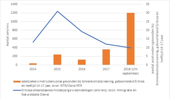 Onder alleenstaande minderjarige asielzoekers uit Eritrea komt de laatste tijd ongekend veel tuberculose voor. Reden voor actie. Sinds begin 2018 is er een toename van tuberculose bij de binnenkomstscreening van asielzoekers jonger dan 18 jaar in het aanmeldcentrum Ter Apel. De patiënten komen allemaal uit Eritrea en reizen onbegeleid, zogenoemde alleenstaande minderjarige vreemdelingen (amv’ers). Van 1 januari tot en met 30 september 2018 werd bij 30 de diagnose tuberculose gesteld; 27 door de GGD (Gemeentelijke Gezondheidsdienst) Groningen en 3 door een GGD elders naar aanleiding van de afwijkende foto bij binnenkomstscreening.