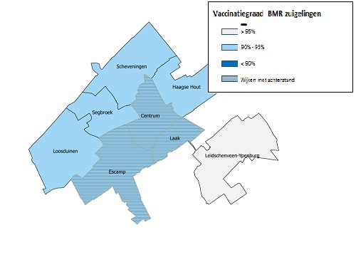 - De vaccinatiegraad is lager in de stadsdelen Centrum en Laak, 2 stadsdelen met achterstand. Zo ligt hier de vaccinatiegraad voor alle vaccinaties, met uitzondering van BMR voor zuigelingen, onder de 90%. In Escamp, het derde stadsdeel met achterstand, ligt de vaccinatiegraad voor zuigelingen en kleuters boven de 90%, maar voor schoolkinderen en adolescente meisjes daaronder. Ook valt in Escamp de vaccinatiegraad voor HPV in negatieve zin op (35%).