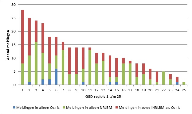 Figuur 3. Aantallen meldingen in alleen Osiris, alleen NRLBM-bestand en in beide, per GGD regio (genummerd 1 t/m 25) van 2009 t/m 2017