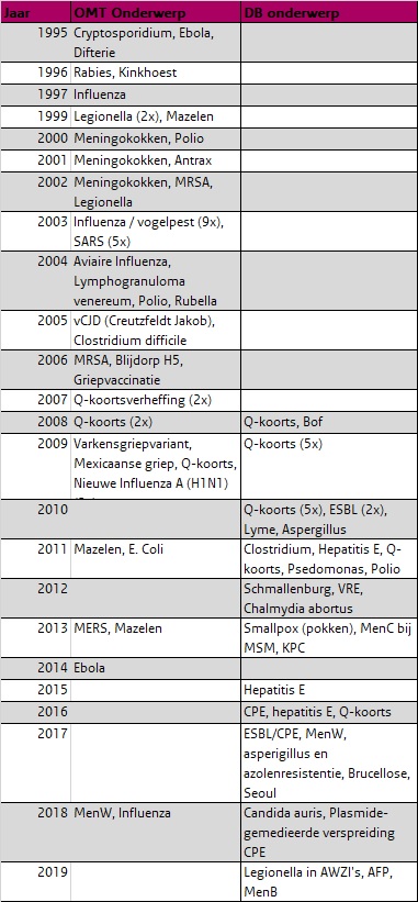 In 2018 en 2019 schaalde LCI een aantal keren op. In 2018 werden 33 afstemmingsoverleggen (AO) georganiseerd, tweemaal een deskundigenberaad (DB) en tweemaal een bijeenkomst van het Outbreak Management Team (OMT). In 2019 waren 28 AO’s en 3 DB’s. In tabel 1 staan alle OMT (Outbreak Management Team)’s en DB’s die plaats hebben gevonden in de historie van de LCI. We belichten graag enkele bijzondere cases waar u zelf mogelijk ook mee te maken hebt gehad.